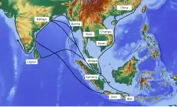 • sur la base d'un commerce international ancien, un courant continu d'échanges se serait établi entre l'Inde et l'Asie du Sud-Est.
