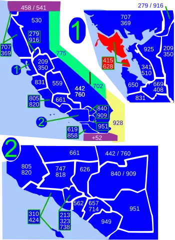 La carte ci-contre indique en rouge le territoire couvert par l'indicatif 415.