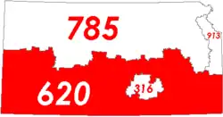 Le , la scission de l'indicatif 316 a créé l'indicatif 620. L'indicatif 316 a conservé la ville de Wichita et la région avoisinante alors que l'indicatif 620 obtenait le reste du territoire original de l'indicatif 316.