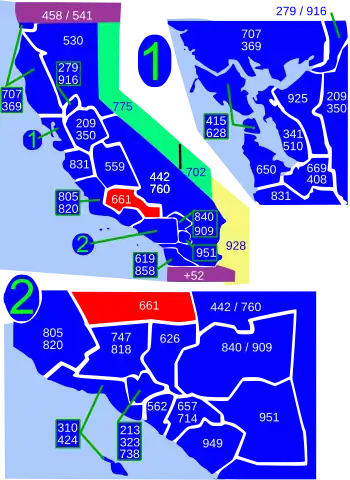 Cet indicatif dessert le nord du comté de Los Angeles (incluant la vallée d'Antelope) et la plus grande partie du comté de Kern (incluant le sud de la vallée de San Joaquin). Plus précisément, il dessert les villes de Bakersfield, Santa Clarita et Palmdale.