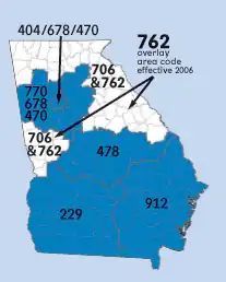 On peut voir les territoires desservis par les indicatifs régionaux de la Géorgie sur cette carte de la North American Numbering Plan Administration.