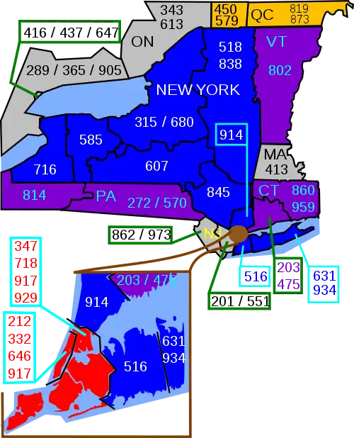 Cet indicatif dessert les cinq arrondissement de la ville de New York : Manhattan, Brooklyn, Queens, Staten Island et Bronx.
