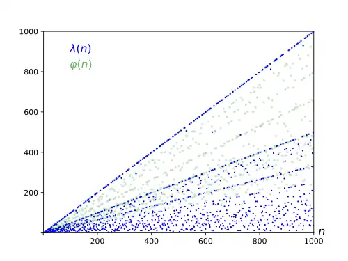 - λ(n) est l'exposant du groupe multiplicatif (ℤ/nℤ)* des éléments inversibles de l'anneau ℤ/nℤ.