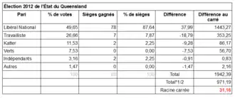 | parti | % de votes | % des sièges | Différence | Carré de la différence |