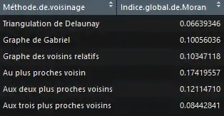 En règle générale, plus une méthode de voisinage va accorder de voisins aux entités, moins l'indice de Moran sera élevé. Le fait d'augmenter le nombre de voisins par observation augmente la probabilité d'obtenir des observations hétérogènes dans le voisinage, ce qui a pour conséquence une autocorrélation spatiale moins visible (surtout pour les indices globaux). Le choix de voisinage a donc une importance certaine dans l'identification de l'autocorrélation spatiale.