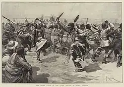 Les cérémonies qui précédaient la guerre consistaient en des danses de guerriers en armes. Avant l'attaque, les Indiens lançaient leur cri de guerre : il devait effrayer l'ennemi et souder le groupe.