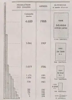 En 1914, la production automobile française (45 000 au total) s'établit comme suit : Peugeot (4 500), Renault (4 000), Berliet (4 000), de Dion-Bouton, Panhard (2 000). Par ailleurs, Ford produit 240 000 voitures aux États-Unis.