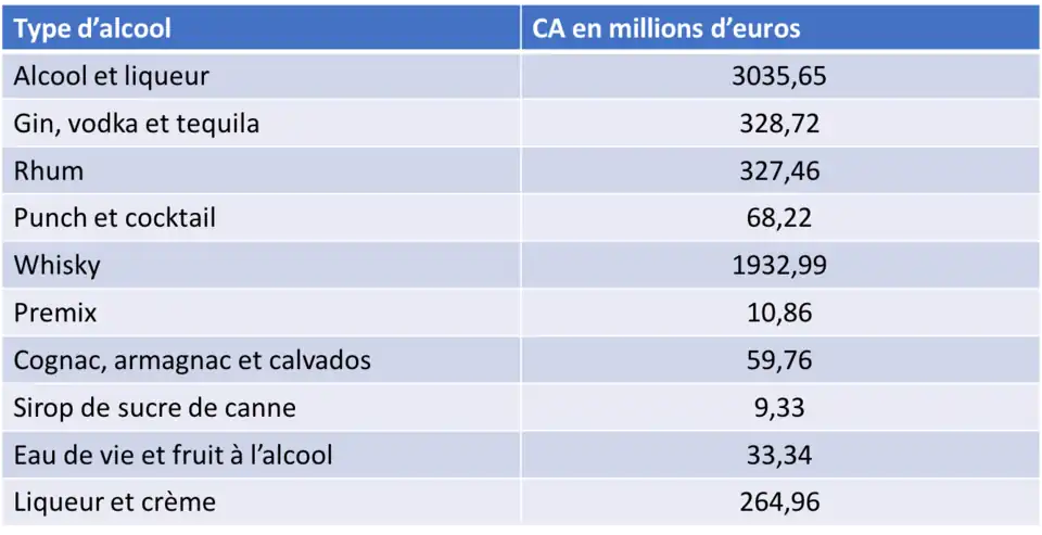 Le marché de l'alcool est un rayon qui dépasse les 12 milliards d'euros (source iri.fr, 2015), ci-dessous le chiffre d'affaires de certains alcools et liqueurs :