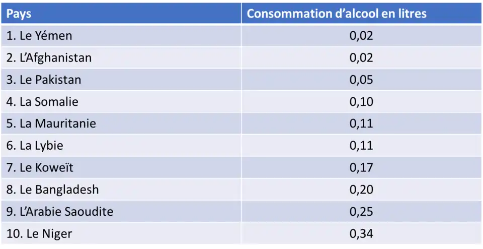 On peut voir que le top 10 n'est composé que de pays d'Europe. Les pays où l'on consomme le moins d'alcool au monde (par an, statistiques de l'OMS[8] 2011) :