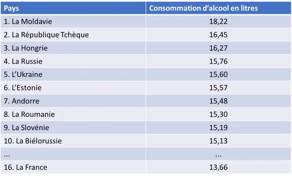 Les pays où l'on consomme le plus d'alcool au monde (par an, statistiques de l'OMS[8] 2011) :