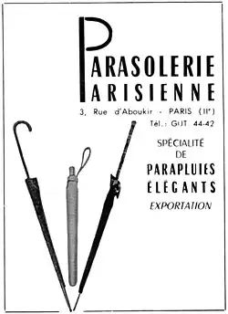 L'usage du parasol se apparaît et se développe en France au XVIIIe siècle[2]. Dans les villes et gros bourgs, le parapluie est un accessoire utile en certaines saisons ou sous certains climats : on change peu de vêtements et, les maisons étant mal chauffées et souvent peu salubres, avoir ses vêtements trempés est aussi désagréable que nuisible à la santé[2]. Tout au long du XIXe siècle et au cours d'une partie du XXe siècle, chaque ville a au moins une parasolerie. Dans les milieux aisés, l'ombrelle ou le parapluie était un accessoire de mode. L'industrie du parasol et du parapluie, à son apogée à la fin du XIXe siècle, fait vivre plus de cent mille personnes en France[1]. En France, les fabriques sont principalement situées dans l'Ouest, dans des villes comme Nantes ou Angers[3]. La ville d'Aurillac est également connue pour son industrie de la parasolerie[2].