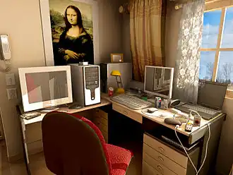 • La radiosité (ou radiance) calcule les échanges d'énergie lumineuse entre éléments de surface de la scène en tenant compte de leurs propriétés de réflexion et d'absorption. Cela nécessite de décomposer la scène en éléments finis de surface. Cela permet des éclairages naturellement doux. Cette technique associée au lancer de rayons et à d'autres voisines permettant les inter-réflexions est une technique d'illumination globale.
