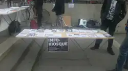 Un infokiosque est un étal (table et/ou présentoir et/ou cartons, classeurs) proposant des brochures, des fanzines, des livres ou d'autres produits généralement culturels.