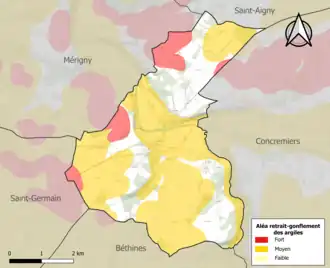 Le retrait-gonflement des sols argileux est susceptible d'engendrer des dommages importants aux bâtiments en cas d’alternance de périodes de sécheresse et de pluie. 67,2 % de la superficie communale est en aléa moyen ou fort (84,7 % au niveau départemental et 48,5 % au niveau national). Sur les 204 bâtiments dénombrés sur la commune en 2019, 132 sont en aléa moyen ou fort, soit 65 %, à comparer aux 86 % au niveau départemental et 54 % au niveau national. Une cartographie de l'exposition du territoire national au retrait gonflement des sols argileux est disponible sur le site du BRGM[20],[21].