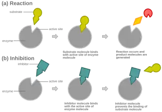 Dans le cas d'une inhibition compétitive, une enzyme peut, à chaque instant, être liée à son substrat, à son inhibiteur compétitif, ou à aucun d'entre eux, mais ne peut pas être liée à la fois à son inhibiteur et à son substrat.