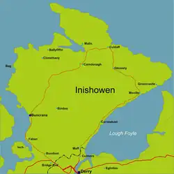 Historiquement les quartiers de Derry situés à l’ouest de la Foyle font partie d’Inishowen. La quasi-totalité des habitants de la péninsule se trouvent sur les côtes. Le centre, presque inhabité, est constitué de montagnes peu élevées, de tourbières. Le sommet le plus élevé est le Slieve Snaght (691 mètres d’altitude) dont le nom irlandais signifie la montagne enneigée.