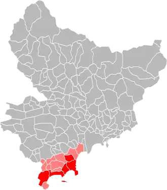 - dans le Var (dix-huit communes) : Les Arcs, Brignoles, Cabasse, Callas, Camps-la-Source, Flassans-sur-Issole, Flayosc, Forcalqueiret, Fréjus, Méounes-lès-Montrieux, La Motte, Néoules, Puget-sur-Argens, La Roquebrussanne, Saint-Antonin-du-Var, Saint-Raphaël, Le Thoronet, Trans-en-Provence.