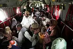 Des vols humanitaires ont commencé le et dès le début de la crise, l'armée américaine a déployé six hélicoptères pour venir au secours de la population dans la vallée de Swat (Nord-Ouest du Pakistan)[26]. Le 11 août, le USS Peleliu, Landing Helicopter Assault de classe Tarawa de la marine des États-Unis, est déployé au large du Pakistan, permettant d'envoyer de 19 hélicoptères supplémentaires dans les zones sinistrées[26]. L'ONU estime pourtant que 37 hélicoptères supplémentaires seraient nécessaires pour venir en aide aux populations isolées[19]. L'USS Kearsarge est déployé le 27 août en remplacement de l'USS Peleliu, ce qui permet d'augmenter de 15 le nombre d'hélicoptères fournissant de l'aide. Au , ces aéronefs ont évacué plus de 8 000 personnes et ont livré quelque 820 tonnes de fournitures humanitaires et 9 unités mobiles d'épuration d'eau envoyées par les États-Unis ont jusqu'ici produit plus de 5,4 millions de litres d'eau propre. Au 17 septembre, ils ont acheminé plus de 3 175 tonnes de fournitures d'urgence et ont transporté plus de 15 000 personnes[27].