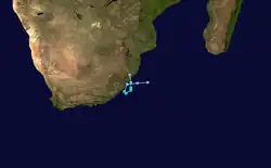 Avec des températures océaniques chaudes et un faible cisaillement du vent, cette dépression coupée a développé des orages intenses qui se sont enroulés autour d'une circulation serrée et ont fait tomber de fortes pluies dans l'est de l'Afrique du Sud. Le , le Centre météorologique régional spécialisé cyclones de La Réunion (CMRS) a désigné le système comme la dépression subtropicale Issa[6]. Cette dernière s'est déplacée ensuite lentement le long de la côte en faiblissant et le CMRS a émis son dernier bulletin à 12 h UTC le , précisant que la dépression résiduelle s'éloignerait vers le sud-est au cours des jours suivants[7].