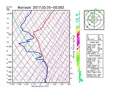L'image à droite montre les conditions aérologiques dans la région le à 20:00 locales. L'air était à peu près stable partout et donc un nimbostratus de 7 km (niveau 400 hPa) de hauteur recouvrait à ce moment-là la région, engendrant des pluies soutenues et durables. En outre un voile de cirrus d'épaisseur de l'ordre de 1 km recouvrait le nimbostratus à environ 11 km d'altitude.