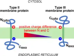 Dans le cas de l'insertion cotraductionnelle, c'est plutôt la différence de charge de part et d'autre du cœur hydrophobe qui guide l'orientation de l'insertion. C'est le côté le plus positif qui est généralement cytoplasmique[10]. Il est donc possible l'orientation du signal en modifiant Ses charges flanquantes[11],[12]. Le changement d'orientation ne touche le plus souvent qu'une partie des protéines produites. Cela signifie tout simplement que la distribution des charges n'est pas le seul déterminant de la topologie membranaire. positive inside rule