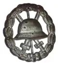 L'insigne est un ovale noir, argent ou or, bordé d'une couronne de lauriers, au centre duquel figure un casque allemand (portant une croix gammée pour l'insigne de 1939) ; derrière le casque sont croisées deux épées.