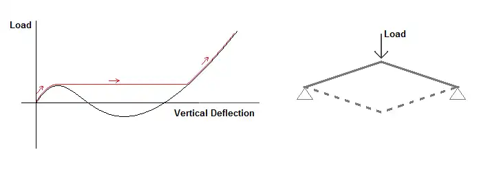 - bifurcation : une bifurcation intervient lorsqu'une petite augmentation des charges produit un changement majeur dans le mode de déformation de la structure. C’est le comportement théorique pour l’instabilité d’une structure parfaite (sans défaut de forme). Voir fig. 3 et 5 ;
