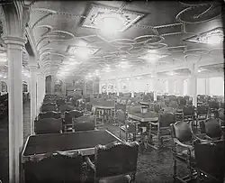 La salle est tapissée de carreaux de linoléum bleu profond sur lesquels se détache un motif élaboré rouge et jaune éclatants, et décorée de boiseries blanches. Ses hublots sont masqués par des vitraux, de façon à recréer l'intérieur d'une maison plus que d'un navire. La nuit, elles sont éclairées par derrière pour illuminer la pièce, qui dispose également de nombreuses lampes. La chaleur qu'elles dégagent est telle que des ventilateurs électriques sont répartis dans la pièce pour le confort des passagers[a 22]. Les menus, très copieux, sont préparés dans une cuisine adjacente, qui sert également à préparer les repas des passagers de deuxième classe[a 23].