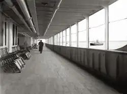 Une toile peut être abaissée devant les ouvertures pour protéger les passagers du soleil, comme en témoignent des photographies prises par Francis Browne lors de l'escale de Queenstown[30]. Sur ce pont, les passagers peuvent louer une chaise longue. Ces chaises sont numérotées (pair à tribord et impair à bâbord) et ont des emplacements spécifiques qui peuvent être réservés. Pour ne pas choquer les passagers superstitieux, aucune chaise ne porte le numéro 13[a 47].