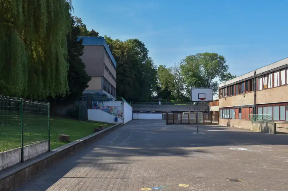 Les zones engazonnées qui débordaient sur la cour de récréation ont été réduites et sont, ultérieurement, remplacées par un mur de soutènement d’environ cinquante centimètres.