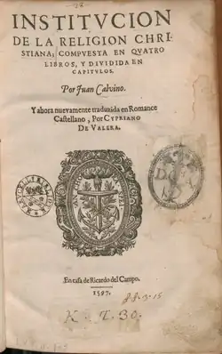 - ↑ Institution de la religion chrétienne, comprenant presque toute la somme de piété et tout ce qui doit être connu dans la doctrine du Salut.