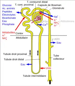 - ainsi que la recapture de composés qui ont été excrétés dans l'urine primitive par ultrafiltration dans les glomérules rénaux, comme le glucose, les acides aminés, et les sels minéraux.