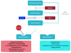 - cette dernière est rapidement hydrolysée en angiotensine II sous l’action de l’enzyme de conversion de l’angiotensine (ECA). L’angiotensine II est responsable d’une vasoconstriction de l'artériole glomérulaire efférente et d’une remontée de la pression sanguine dans le glomérule, avec augmentation également des résistances périphériques.