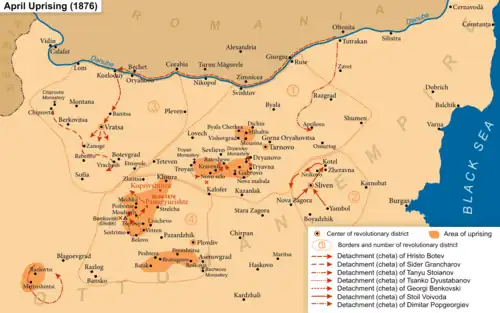 Au cours de la préparation de l’insurrection, les organisateurs abandonnèrent l’idée d’un cinquième district à Sofia à cause de la situation déplorable des comités révolutionnaires locaux et ils déplacèrent le centre du quatrième district révolutionnaire de Plovdiv à Panagyurichté. Le , une réunion générale des comités des quatre districts révolutionnaires se tint dans la localité de Oborishte près de Panagyurishté pour discuter de la proclamation de l'insurrection. L'un des délégués, cependant, divulgua le complot aux autorités ottomanes. Le , la police ottomane tenta d'arrêter le chef du comité révolutionnaire local de Koprivchtitsa, Todor Kableshkov (en).