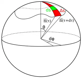 Il reste maintenant à déterminer l'expression de l'action qui est liée aux phases de Berry. L'angle solide balayé par le vecteur lors de son évolution peut être calculée comme suit. L'aire du triangle représenté en rouge sur la figure ci dessus vaut