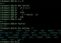 irb(main):001:0> n = 5 => 5 irb(main):002:0> def fact(n) irb(main):003:1> if n <= 1 irb(main):004:2> 1 irb(main):005:2> else irb(main):006:2* n * fact(n - 1) irb(main):007:2> end irb(main):008:1> end => nil irb(main):009:0> fact(n) => 120