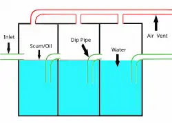 Les intercepteurs d'essence partent du principe que certains hydrocarbures, tels que le pétrole et le diesel, flottent au-dessus de l'eau. L'eau contaminée pénètre dans l'intercepteur généralement après s'être écoulée des routes ou des avant-cours et dans un drain de canal avant d'être déposée dans le premier réservoir à l'intérieur de l'intercepteur. Le premier réservoir constitue une couche d'hydrocarbures ainsi que d'autres écumes. Les intercepteurs à essence disposent généralement de 3 réservoirs distincts reliés chacun à un tuyau plongeur, car de plus en plus de liquide pénètre dans celui-ci et de l'eau pénètre dans le deuxième réservoir, laissant la majeure partie de l'hydrocarbure à l'arrière car il ne peut pas pénétrer dans le tuyau plongeur dont l'ouverture dans le deuxième réservoir est inférieure. la surface de l'eau. Cependant, certains contaminants peuvent pénétrer par hasard dans le second réservoir. Ce second réservoir n'accumulera pas autant d'hydrocarbures à sa surface. Comme précédemment, l'eau est poussée dans le troisième réservoir, par la dynamique des fluides, au fur et à mesure que de l'eau pénètre dans le second. Le troisième réservoir doit être pratiquement dégagé de tout hydrocarbure flottant à sa surface. Par précaution, le tuyau de sortie est également un tuyau plongeur. Lorsque l'eau quitte le troisième réservoir par le tuyau de sortie, elle ne doit pas contenir de contaminants.