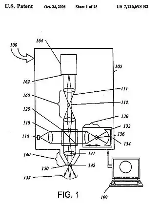 N°130 : bras de référence contenant des optiques complémentaires pour compenser les aberrations produites dans le bras de mesure.