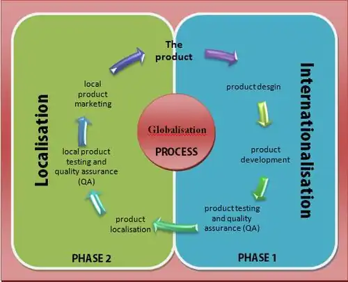 Microsoft[5] définit l’internationalisation comme une combinaison entre l’expression anglaise « World-Readiness » et la régionalisation. World-readiness est une tâche qui incombe au développeur, et qui permet d’utiliser un produit avec de nombreux caractères d’écriture et de nombreuses cultures (globalisation) tout en séparant les ressources internationalisables de l’interface utilisateur dans un format régionalisable (localisability, abrégée en l12y)[6].