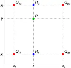 La valeur f(x,y) est la valeur interpolée au point de coordonnées (x,y), et a, b, c, d sont des constantes déterminées à partir des quatre voisins (x1,y1), (x1,y2), (x2,y1), (x2,y2) du point (x,y) dont on cherche la valeur. Connaissant les valeurs en ces points, on peut écrire un système de 4 équations à 4 inconnues: