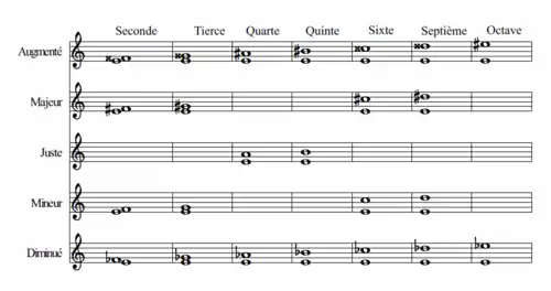 - ↑ On remarquera qu'à l'exception de l'unisson et de la septième, les noms utilisés pour les intervalles inférieurs à la neuvième sont directement dérivés des adjectifs numéraux ordinaux latins correspondants, alors que pour la septième et les intervalles supérieurs à l'octave, on utilise directement les adjectifs numéraux ordinaux du français.