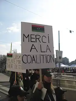 En , durant la révolution libyenne, les combats opposant les forces fidèles au colonel Mouammar Kadhafi à celles des rebelles opposés à son régime, auraient fait des milliers de morts[24],[25]. Les insurgés ayant perdu beaucoup de terrain se sont retranchés notamment à Misrata et surtout Benghazi. À la veille de l'assaut final contre cette dernière ville, ils sont alors menacés d'une répression sanglante par le dirigeant de la Jamahiriya arabe libyenne[26].