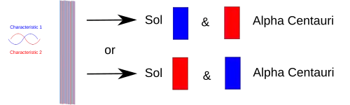 Imaginons que la superposition d'un état mentalement matérialisé en bleu et d'un autre état matérialisé en rouge, va apparaître (toujours mentalement) en un état violet. Deux photons sont produits par le même évènement atomique. Peut-être qu'ils sont produits par l'excitation d'un cristal dont la caractéristique est d'absorber un photon d'une fréquence donnée et d'émettre deux photons ayant la moitié de la fréquence originale. Ainsi les deux photons apparaissent en violet. Maintenant, si l'expérimentateur réalise une expérience pour déterminer si l'un des photons est bleu ou rouge, alors cette expérience va modifier le photon observé d'un état de superposition de deux caractéristiques, bleu et rouge, vers un photon qui n'a qu'une seule de ces deux caractéristiques. Le problème qu'a eu Einstein en imaginant une telle situation était que si l'un de ces photons était conservé dans un laboratoire sur Terre, rebondissant entre deux miroirs, et que l'autre était envoyé à mi-chemin vers l'étoile la plus proche, alors une fois que son jumeau serait forcé de révéler sa couleur (bleu ou rouge), le photon distant devrait lui aussi perdre son état violet. Ainsi, toute vérification effectuée après que son jumeau a été mesuré, devait nécessairement montrer un état opposé à ce que son jumeau avait dévoilé.