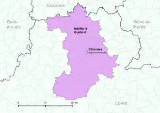 La loi du portant nouvelle organisation territoriale de la République (dite loi NOTRe), visant une réduction du nombre d'intercommunalités en France, fait en effet passer le seuil démographique minimal de 5 000 à 15 000 habitants, sauf exceptions, et a un impact sur les périmètres des différentes intercommunalités. Le schéma départemental de coopération intercommunale du Loiret est arrêté sur ces bases le et le nombre d'établissements publics de coopération intercommunale à fiscalité propre passe dans le département du Loiret de 28 (2 communautés d'agglomération et 26 communautés de communes) à 16 (deux communautés d'agglomération et 14 communautés de communes dont une interdépartementale)[42]. Les communautés de communes de Beauce et du Gâtinais, du Cœur du Pithiverais et du Plateau Beauceron fusionnent ainsi à compter du en une seule entité : la communauté de communes du Pithiverais, dont le siège est à Pithiviers. Cette nouvelle intercommunalité comprend 31 communes dont Intville-la-Guétard[43].