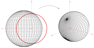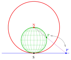 Une projection stéréographique projette généralement une sphère à partir d'un point (pôle nord) de la sphère sur le plan tangent au point opposé (pôle Sud). Cette cartographie peut être réalisée par une inversion de la sphère sur son plan tangent. Si la sphère (à projeter) a pour équation (écrit alternativement ; de centre , de rayon , en vert sur l'image), alors il sera projeté par l'inversion par rapport à la sphère unité (rouge) sur le plan tangent au point . Les droites passant par le centre d'inversion (point ) sont projetés sur eux-mêmes. Ce sont les lignes de projection de la projection stéréographique.