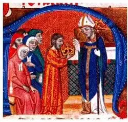 La première trace certaine d'une investiture rituelle remonte au sacre du roi Wamba en 672 raconté par Julien de Tolède dans son Historia Wambae regis[1], même s'il est possible que d'autres cérémonies aient pu avoir lieu auparavant[2] (peut-être même à l'occasion de la conversion de Récarède en 589). Rappelant les onctions bibliques des rois d'Israël[3] mais étant encore inédit dans le monde occidental du Moyen Âge, le rituel du sacre sera ensuite exporté dans les royaumes francs à partir de 751 par Pépin le Bref, et dans les seigneuries irlandaises dès 794[4].