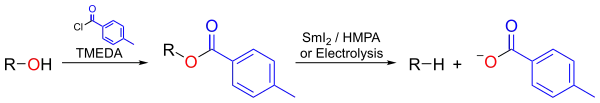Dans la désoxygénation de Markó-Lam, un alcool peut être quasi instantanément désoxygéné par réduction de son ester toluate en présence de SmI2 :