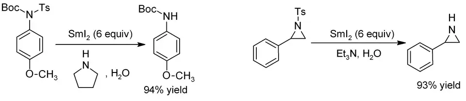Les groupes tosyle peuvent être retirés presque instantanément des N-tosylamides et des esters tosylate en utilisant SmI2 en association à une base. Cette réaction est même effective pour la synthèse d'amines sensibles comme les aziridines[11] :