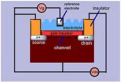 La broche gate est réalisée dans un matériau sensible à la concentration en ion hydrogène, ce qui fait varier la tension de seuil en conséquence. En pratique il s'agit de nitrure de silicium (Si3N4) ou d'oxyde d'aluminium (Al2O3) ou de tantale (Ta2O5).