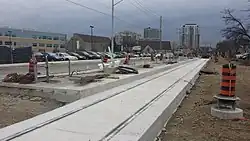 Entre les autres stations, les voies d'Ion sont le long d'une rue en site propre.